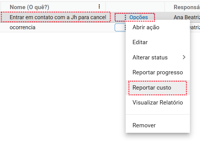 Na ação em que você deseja reportar custo, clique sobre ela com o botão esquerdo do mouse ou utilize o botão