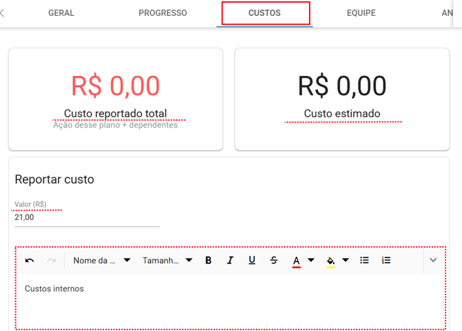 Custo Estimado: Mostra o valor informado no campo "Custo estimado (Quanto?)" localizado na aba geral da ação.