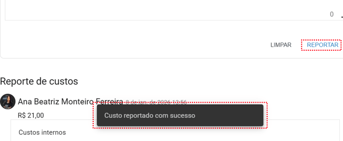 A janela onde é feito o reporte de custo será aberta para que o preenchimento seja feito.
