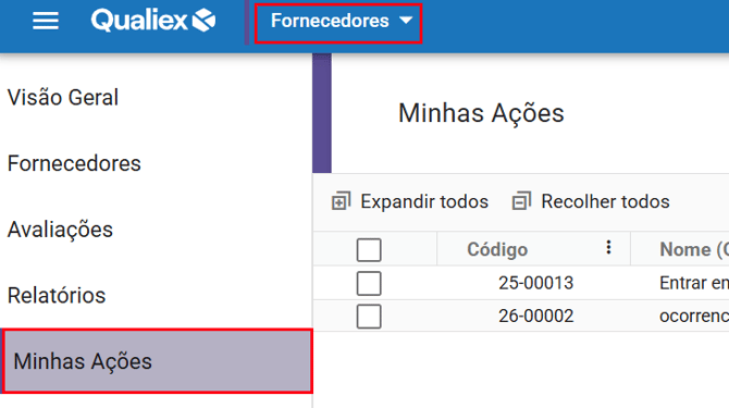 No módulo Fornecedores, acesse a aba "Minhas Ações".