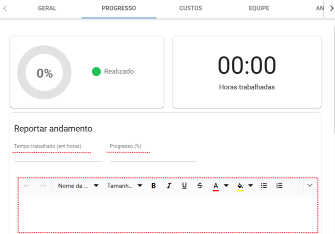 Ao abrir a ação, é possível reportar progresso em "Progresso". Preencha: