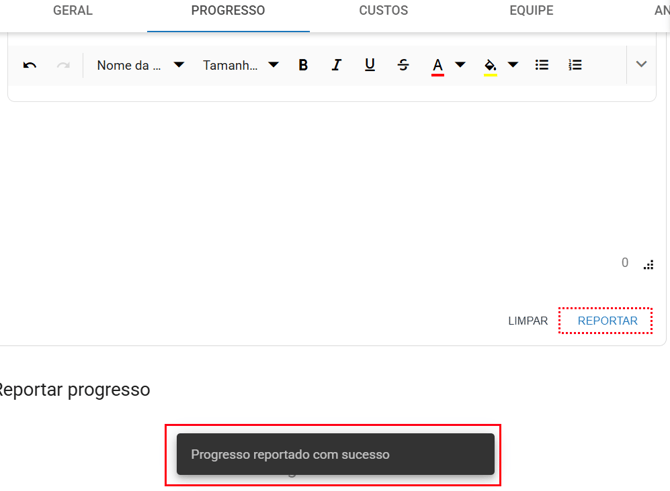 Progresso da ação realizado com sucesso! agora aparecera em "Report de andamento" os reports feitos