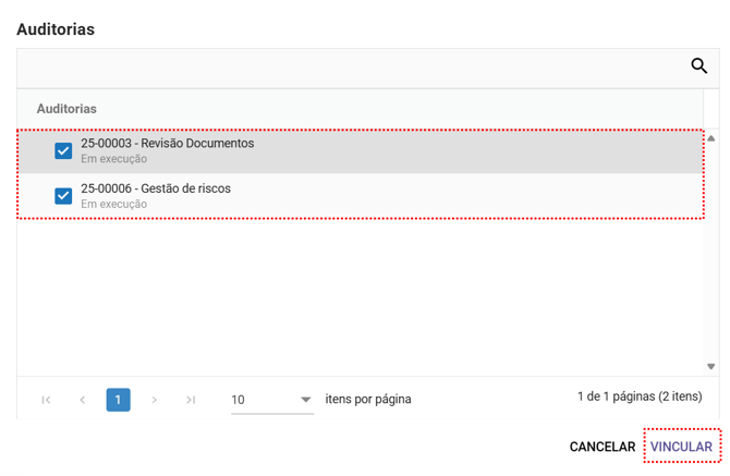 Selecione as auditorias que deseja relacionar e conclua a operação clicando em vincular.