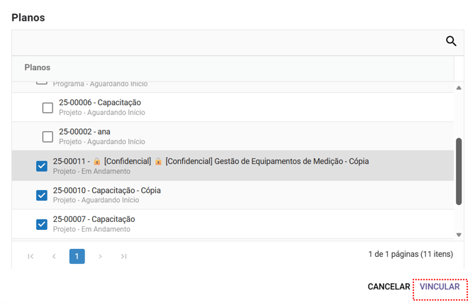 Será exibida uma janela com os programas e projetos que o colaborador possui permissão para visualizar no módulo planos e que ainda não foram concluídos. Selecione aqueles que deseja vincular ao fornecedor.