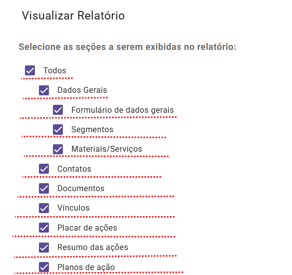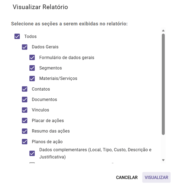 Nessa tela, você poderá marcar ou desmarcar as opções para escolher os tópicos desejáveis para serem exibidos no relatório.