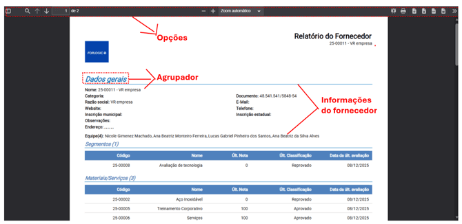 Ver o relatório geral de fornecedores proporciona uma visão abrangente e detalhada sobre como o fornecedor está contribuindo para as operações da empresa. Esse relatório incluí dados gerais do fornecedor (Formulário de dados gerais, Segmentos, Materiais/Serviços), contatos cadastrados, documentos vinculados, vínculos, placar de ações, resumo de ações e planos de ação.