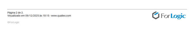 Ao final de cada página do relatório teremos informações para a rastreabilidade: qualidade de páginas, nome da sua empresa, data e hora de visualização do relatório, e em qual site. No canto inferior direito teremos a logo da Forlogic. Essas informações evidenciam que o relatório foi gerado por um sistema computadorizado.