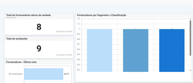 - Fornecedores por Segmento X Classificação: Acompanhe o total de avaliações realizadas por segmento e quais foram suas classificações.