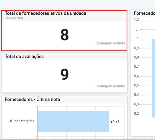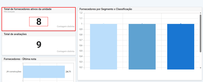 - Total de fornecedores ativos na unidade: Acompanhe todos os fornecedores que estão ativos na unidade.