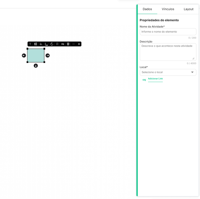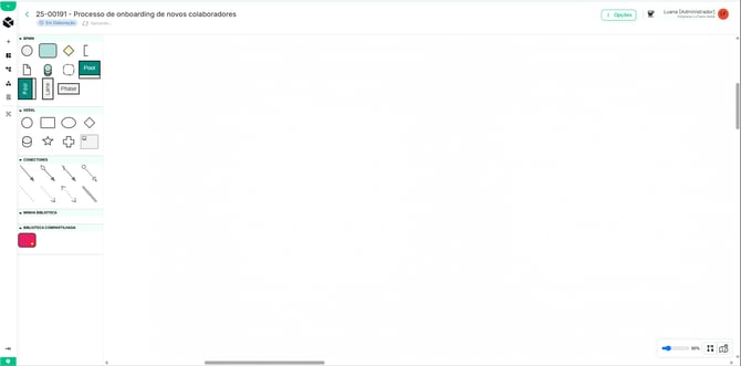 É o espaço central onde o usuário insere, conecta e organiza as formas que representam as etapas do processo.Principais ações: