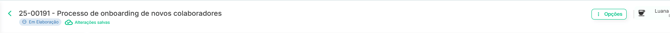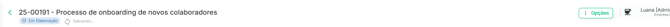 Exibe o código de identificação do fluxo no sistema, o nome do fluxo, o status atual, além dos botões de ação (Opções) e do indicador de salvamento automático.![]()