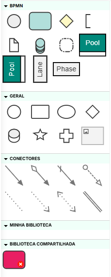 Reúne as formas e conectores disponíveis para criação e modelagem do processo.Cada grupo pode ser expandido ou recolhido individualmente, permitindo foco apenas nas categorias necessárias.