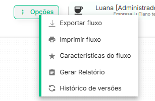 - Opções (⋮): Imprimir, Exportar, Características do fluxo, Gerar Relatório, Histórico de versões.