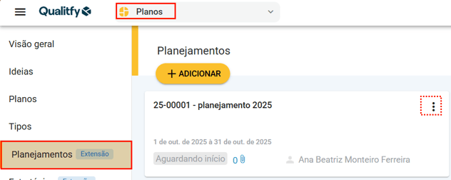 Na aba de Planejamentos, localize o planejamento desejado e clique no menu de contexto