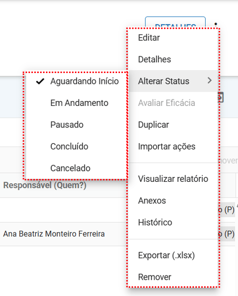 Ao clicar no menu, serão exibidas diversas ações disponíveis para o seu projeto, como acessar o relatório, editar informações ou atualizar o status de acordo com sua necessidade.