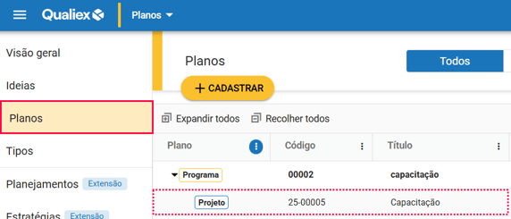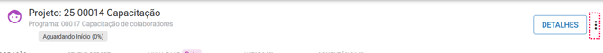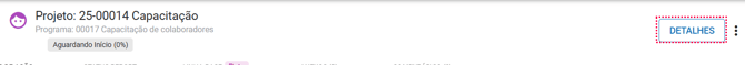 Ao acessar um projeto dentro do módulo Planos, você será direcionado automaticamente para a área interna do projeto. No canto superior direito, está a aba "Detalhes", que apresenta uma visão consolidada.