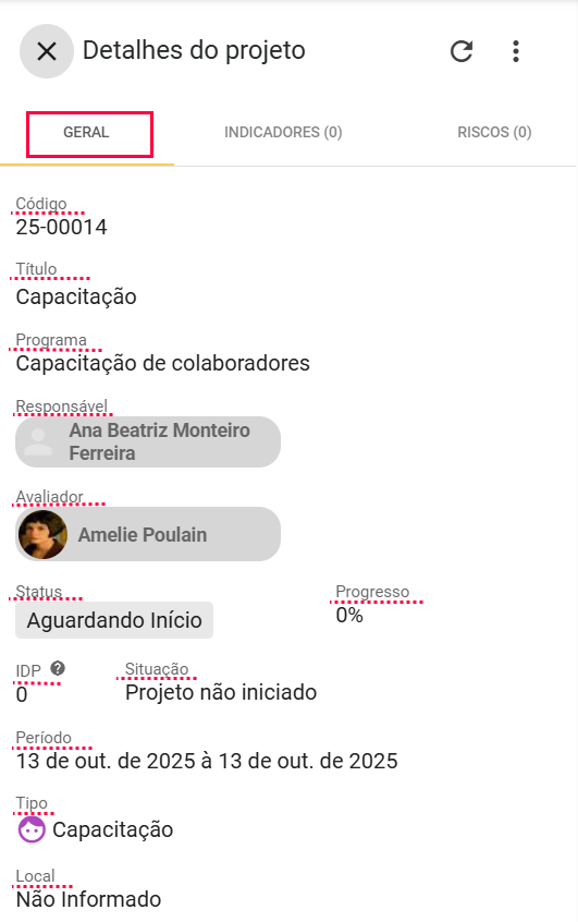 - Tipo: categoria do projeto (ex: capacitação, melhoria contínua).