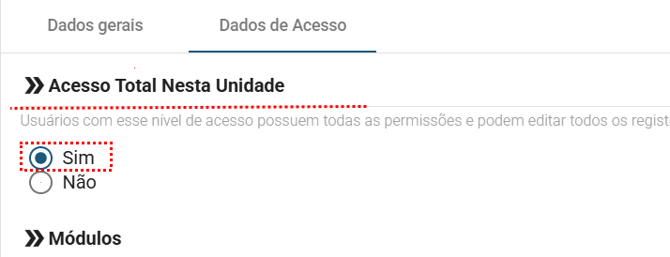 Usuários que possuem a permissão de Acesso Total também herdam algumas permissões nos módulos do sistema. Isso significa que, mesmo que não tenham nenhuma permissão específica configurada em determinado módulo, ainda assim poderão realizar algumas ações dentro dele.