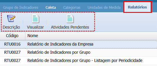 Ele não terá acesso às abas Grupo de Indicadores, Categorias e Unidades de Medida.