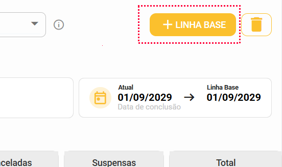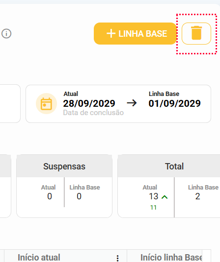 Dentro da aba de "Linha Base" é onde conseguimos visualizar, cadastrar e atualizar e remover as linhas bases do seu projeto!