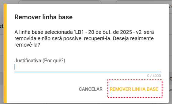 Leia com atenção a mensagem de confirmação e como boa prática deixe a justificativa do por que está removendo a linha base. Após isso, clique no botão "REMOVER LINHA BASE" para confirmar e remover permanentemente sua linha base