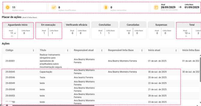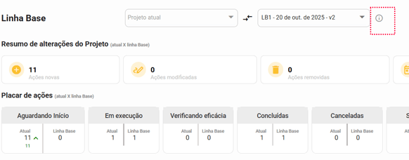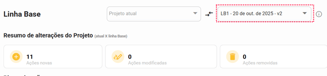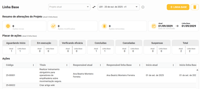 Por exemplo, após ter gerado a linha base "LB 1 - 20 de out. de 2025 - v1" (nome da linha base), eu fui e removi uma ação, atualizei o status e o responsável de outra ação, criei uma nova ação e prolonguei o prazo do meu projeto. Todas essas informações serão exibidas para mim da seguinte forma: