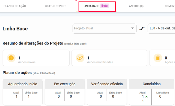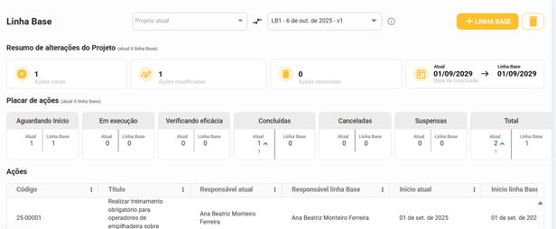 Após uma linha base ser criada, ela captura as informações das ações e do seu projeto no momento em que ela foi gerada, e exibe todas as informações trazendo comparações entre a linha base e como o projeto está no momento atual. A partir desse momento, qualquer alteração que for feita no projeto e nas ações do mesmo serão exibidas no "Atual".