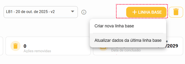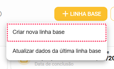 Para criar uma nova linha base, após ter acessado a aba de "Linha Base", basta clicarmos no botão e depois selecionar a opção "Criar nova linha base".