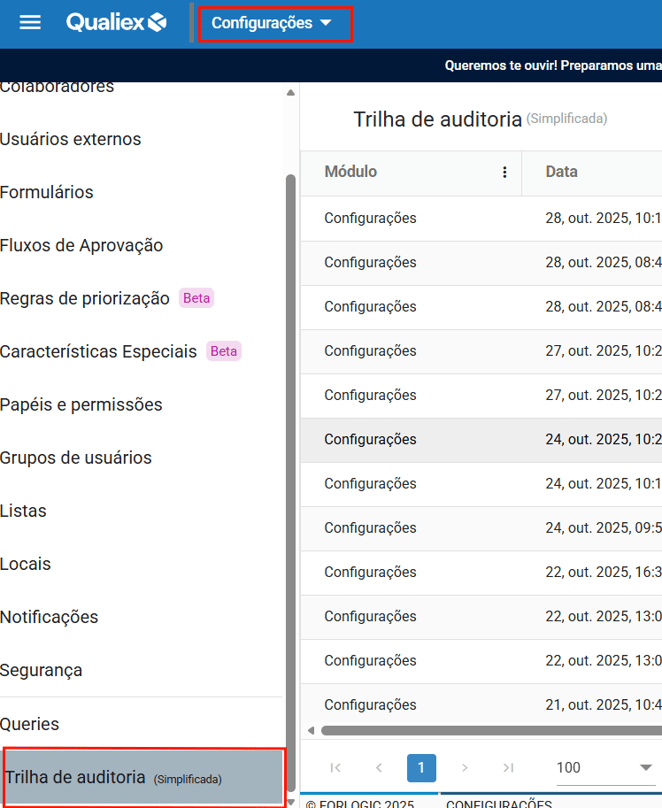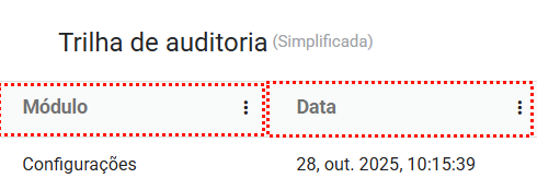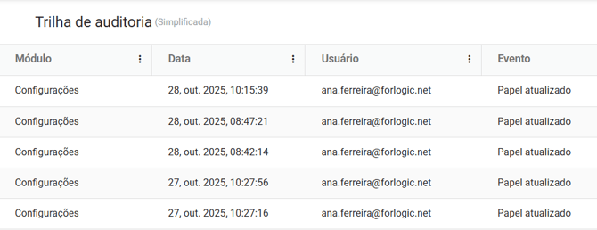 Para acessar a trilha de auditoria no módulo de Configurações, selecione a aba “Trilha de auditoria (simplificada)”.