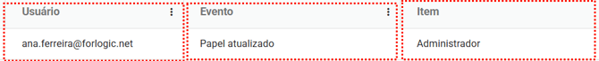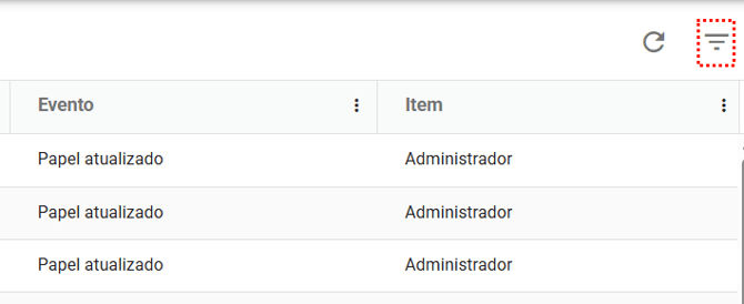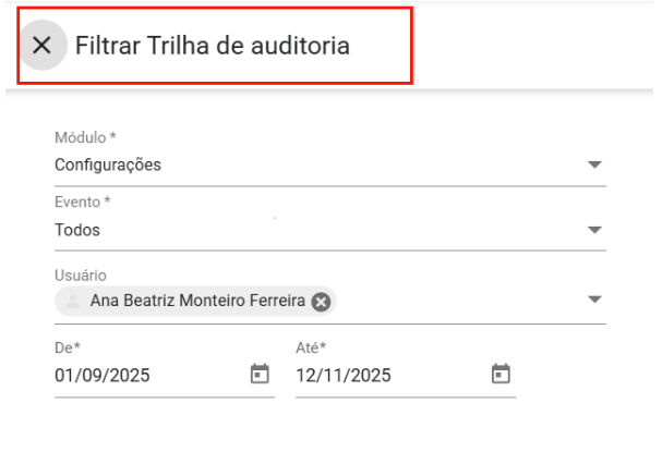 - Exportar : os dados filtrados nos formatos CSV, PDF ou XLSX (desde que o usuário tenha a permissão de Baixar trilha de auditoria).