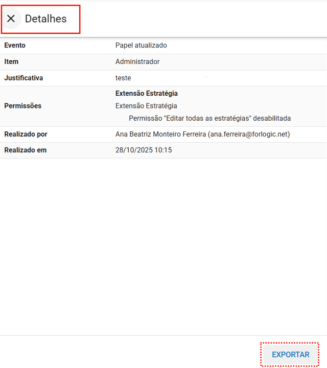 Além disso, é possível exportar os dados de um evento específico diretamente da janela de detalhes, também nos formatos CSV, PDF ou XLSX.