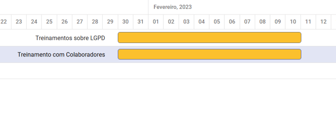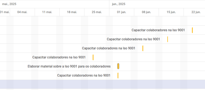 O gráfico de Gantt exibe todas as ações cadastradas no planos, distribuídas ao longo de uma linha do tempo. Cada barra representa uma ação, com início e fim definidos pelas datas configuradas no sistema. Essa visualização facilita a identificação de sobreposições, atrasos, prioridades e dependências entre atividades.