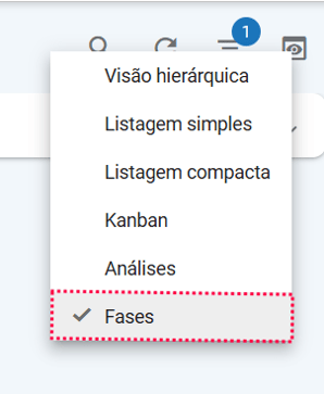 Agora, dentro do projeto devemos selecionar o botão que permite mudar a visualização do projeto e escolher "Fases" como opção:
