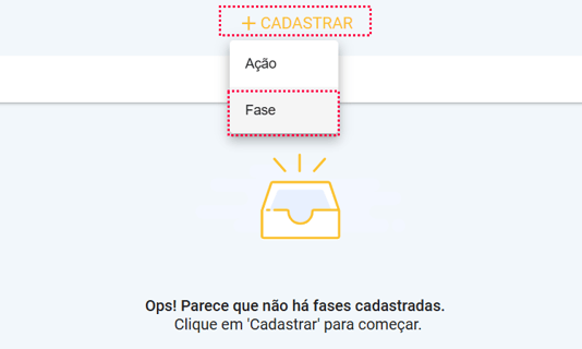 Dentro da visualização de "Fases" é onde conseguimos visualizar, cadastrar, editar e remover as fases do seu projeto!