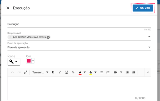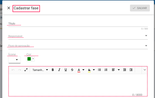 • Descrição: Um editor de texto rico (Rich Text Editor) com várias opções de formatação (negrito, itálico, listas, alinhamento, etc.), onde você pode descrever ou adicionar detalhes sobre a fase. Limite de 8000 caracteres.
