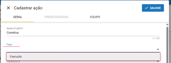 Durante o cadastro de uma ação, devemos preencher o campo "Fase" com a fase que gostaríamos de selecionar para a ação.