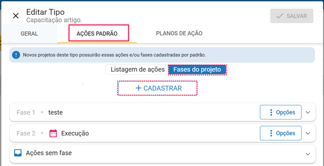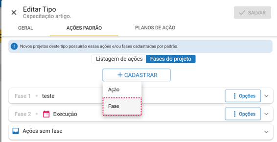 - Cadastrar: salva a fase padrão e a vincula ao tipo de projeto.