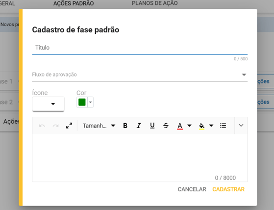 - Fluxo de aprovação : Permite associar um processo de validação à fase, garantindo que as ações nela contidas passem por análise formal antes de serem concluídas