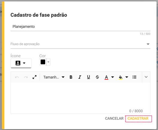 🔎Para saber mais sobre fluxo de aprovação clique aqui Fluxo de aprovação para as fases no Planos - Ícone: Escolha um símbolo visual para representar a fase, facilitando a identificação rápida.