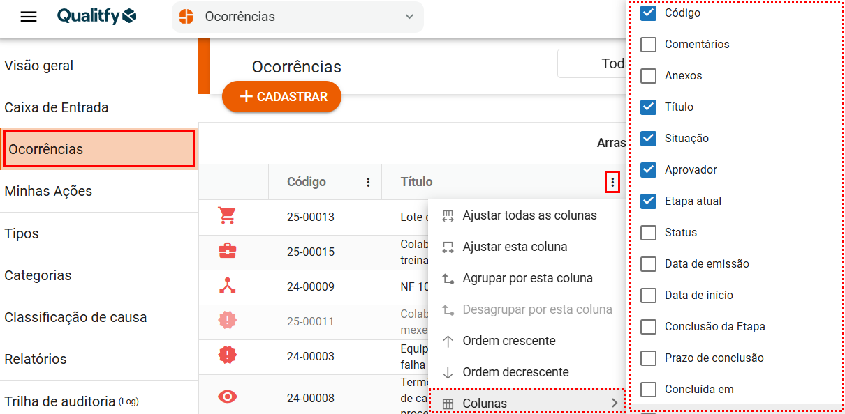 Colunas Exibidas no Ocorrências, como Retirar e Inserir Novas no Qualitfy?