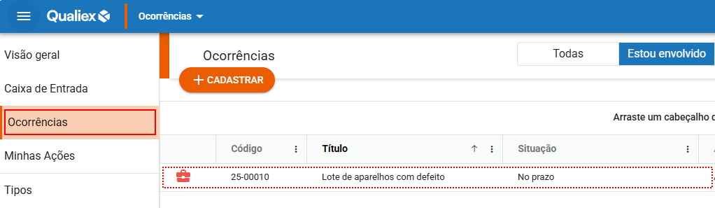 Para alterar o responsável de uma ocorrência, clique na aba ocorrências e selecione a ocorrência desejada.