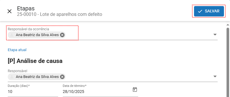 Pela mesma aba, também é possível alterar os responsáveis pelas demais etapas do tratamento da ocorrência. Ao concluir as alterações, clique em "Salvar" para gravar.