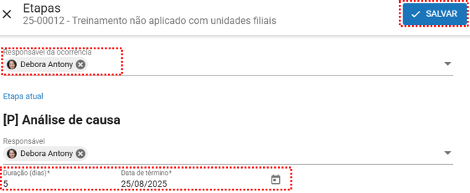Se um colaborador está de férias e queremos dar continuidade em uma ocorrência em que ele está como responsável, podemos alterar a responsabilidade e até mudar o prazo desta etapa.