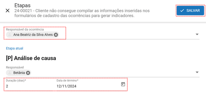Se um colaborador está de férias e queremos dar continuidade em uma ocorrência em que ele está como responsável, podemos alterar a responsabilidade e até mudar o prazo desta etapa.