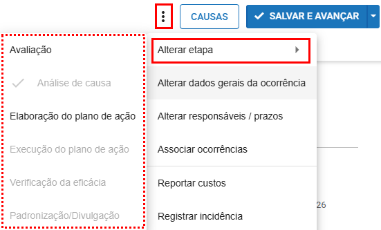 Após acessar a ocorrência, clique no menu de contexto e selecione a opção Alterar etapa.