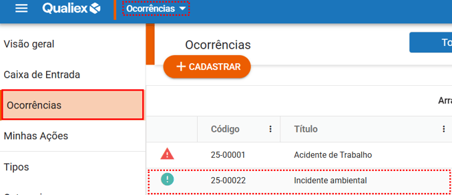 No módulo Ocorrências, acesse a aba "Ocorrências" e selecione a ocorrência na qual deseja registrar uma ação.
