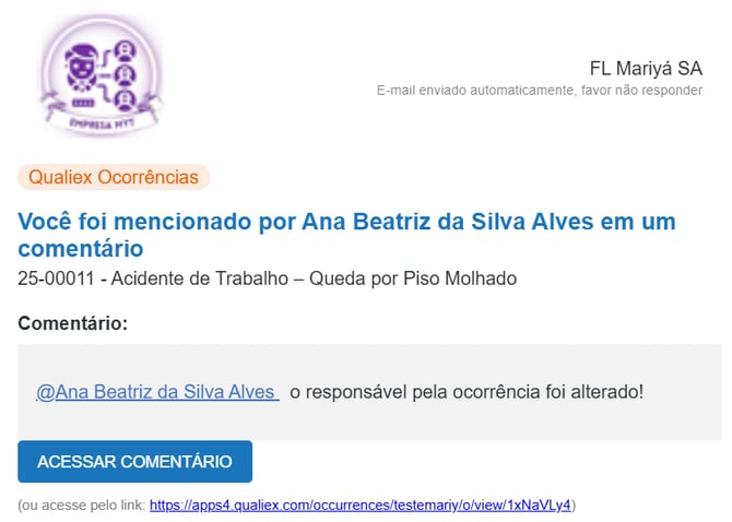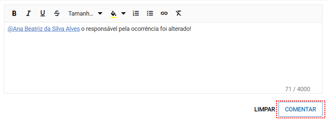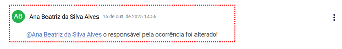 Após registrar uma ocorrência, você pode adicionar comentários e mencionar colaboradores para notificá-los por e-mail. Essa funcionalidade permite interagir com os envolvidos ou manter outros a par de informações relevantes, independentemente da etapa em que a ocorrência se encontra.