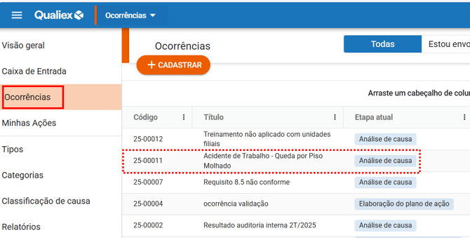 Acesse a aba Ocorrências e, em seguida, clique na ocorrência na qual deseja adicionar o comentário.