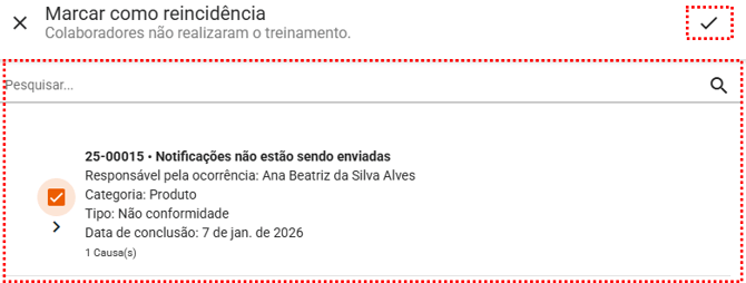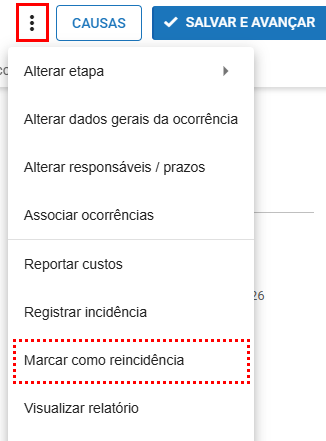 Mesmo após tratar a causa da ocorrência e concluir o plano de ação, pode ser que o problema volte a acontecer. Nesses casos, você pode marcar a reincidência para registrar esse histórico e avaliar a necessidade de um novo plano de ação.