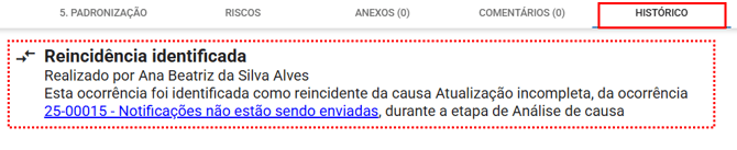 O registro da reincidência também fica disponível no histórico da ocorrência para acompanhamento.